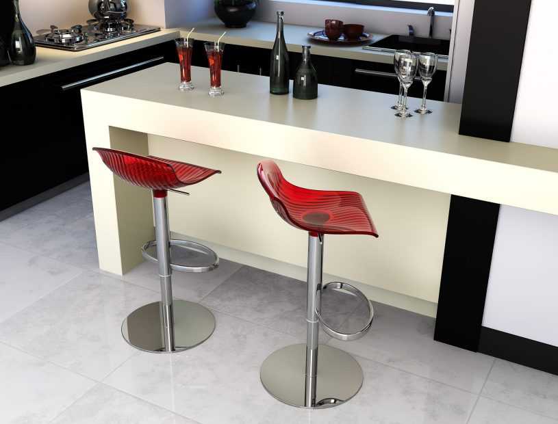 Барные стулья – не самый распространенный вариант, так как не всем приходится по душе их высота. Именно она становится определяющим параметром при выборе. Первым делом определяют высоту стойки, а затем выбирают стулья в соответствии с ней. В дальнейшем это сыграет определенную роль в экономии пространства, так как правильно подобранный размер позволит задвигать стул под столешницу.