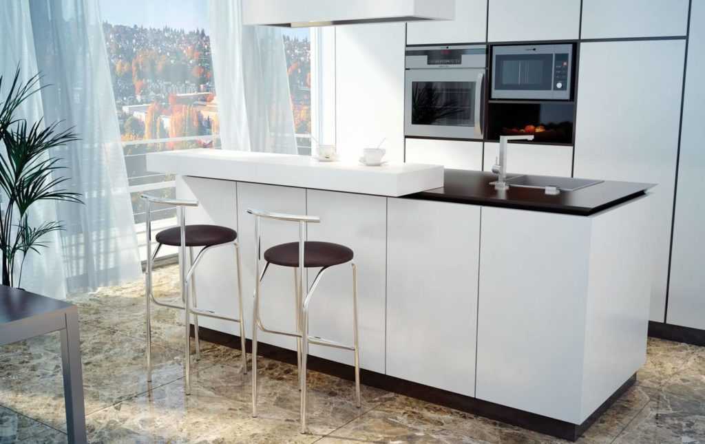 - Высокие – высотой 90-95 см. Обычно полноразмерные стойки высотой 100-115 см устанавливают на больших и просторных кухнях. К такой конструкции нужны соответствующие стулья с увеличенной высотой ножек.