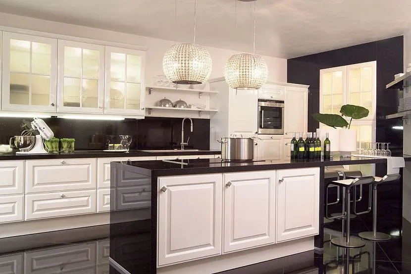 Для белой кухни с черной столешницей в зоне фартука используют закаленное стекло. Под защитным слоем можно спрятать древесину и декоративную штукатурку. Роскошно смотрится поверхность с рисунком-скинали. Материал бывает глянцевым и матовым, что часто обыгрывают при оформлении.