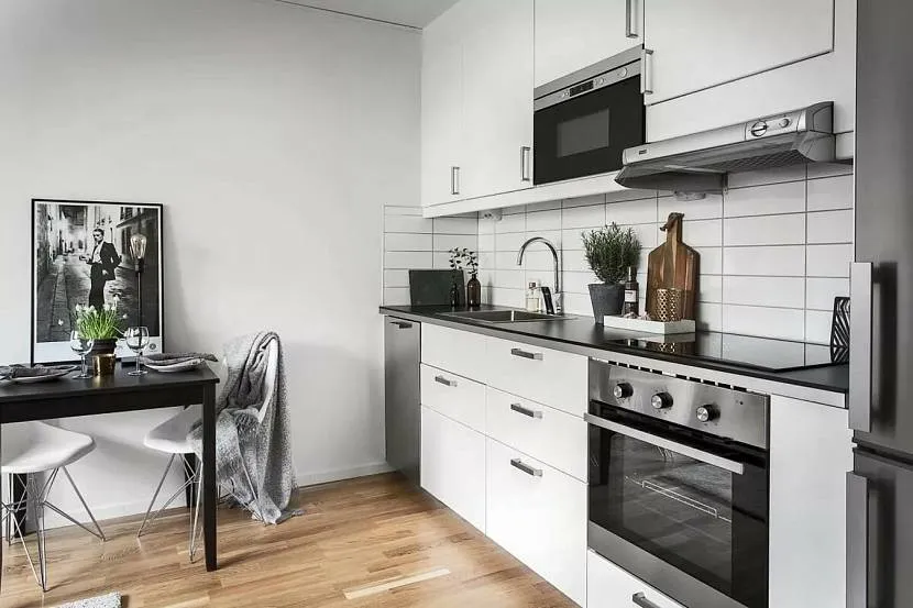 Расширить пространство в комнате для приготовления пищи поможет правильная отделка рабочей зоны. Для облицовки фартука дизайнеры рекомендуют использовать плитку. Универсальная керамика устойчива к температуре и влажности, практична в уходе. Черная сплошная ниша на фоне белых стен и гарнитура смотрится роскошно. Светлая затирка для швов привнесет в интерьер геометрическую четкость.