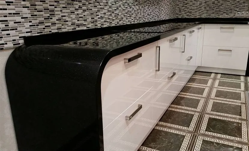 При создании акриловых столешниц гибкий материал не оставляет швов, поэтому элементы кажутся монолитом. Сырье не впитывает посторонние запахи, а пятна воды, жира легко мыть бытовой химией. Поверхность не устойчива к высоким температурам, царапинам, но повреждения быстро восстанавливают специальным составом.