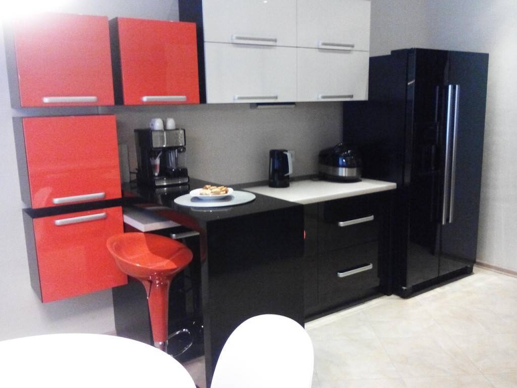 Черно-красная кухня выглядит самодостаточно и допускает использование только простых линий при декорировании, никаких завитков и пестрой фурнитуры она не терпит. Черный низ – красный верх, и наоборот, смотрятся гармонично при наличии третьего фонового белого цвета молочного или оттенка слоновой кости.