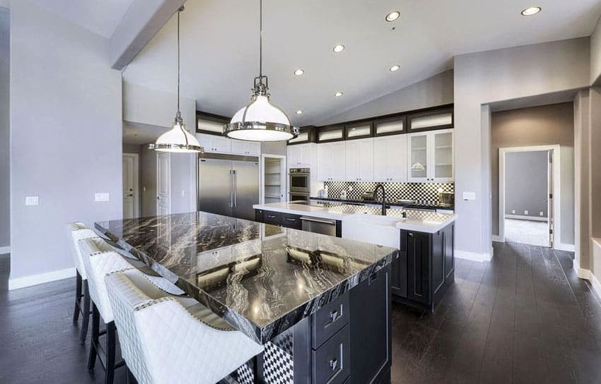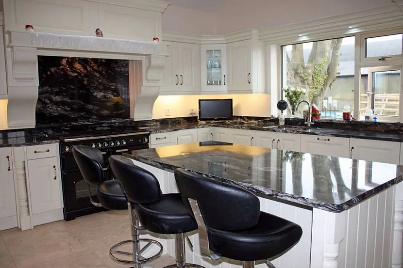 Отличное сочетание белой мебели и темной столешницы из камня сделает акцент на середине кухни, при акцентировании стен можно сделать фартук над рабочей зоной из черной плитки или мозаики. В дополнение черному фартуку и столешнице стильно будут смотреться стол и стулья темного цвета.