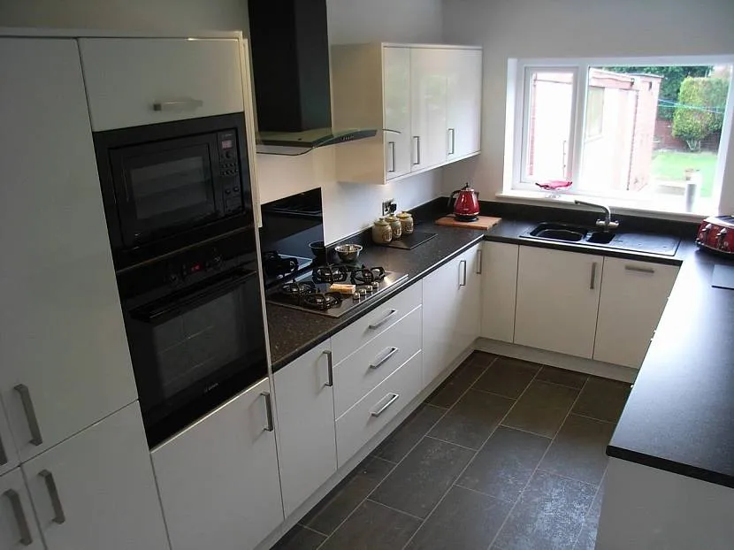 П-образная кухонная мебель расставляется по трем смежным стенам, уместна в прямоугольной кухне маленького и большого размера, а также в квартире-студии. В случае выбора п-образного гарнитура обеденный стол располагают в гостиной или отдельной столовой зоне. Белые фасады без фурнитуры создают ощущение стен и простора в комнате.