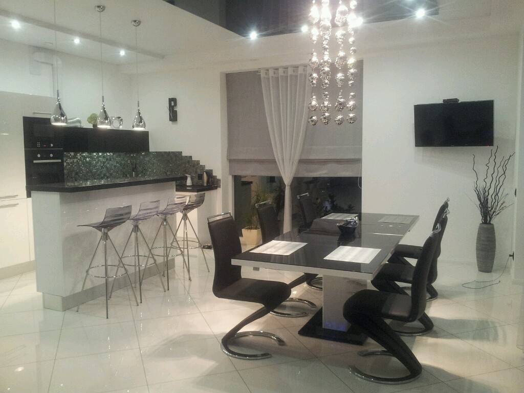 Стол и стулья — важный элемент интерьера черно-белой кухни. В кухне с черным гарнитуром столешница стола может быть черной, а стулья белыми, изящно будет смотреться и обратный вариант.