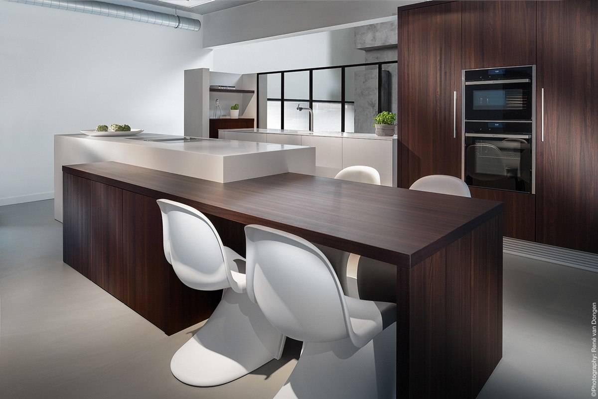 Тёмные столешницы удачно дополняются белыми стульями