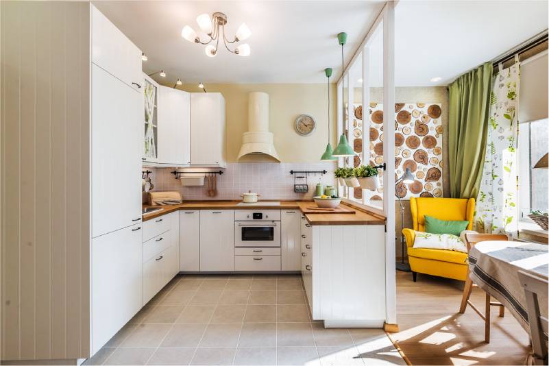 - Визуальное увеличение пространства. Благодаря преобладанию белого цвета в оформлении, кухня будет выглядеть значительно просторнее. Это особенно актуально для небольших помещений. В больших кухнях эффект тоже присутствует, поэтому тут белый можно разбавить не только деревянной столешницей, но и другими акцентами.