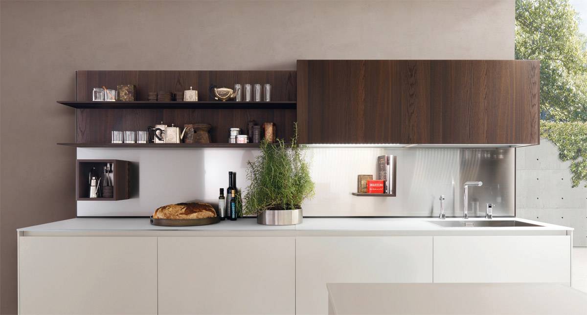 Фартук из нержавеющей стали разделяет тёмные деревянные шкафы и нижние шкафы с белой матовой отделкой.