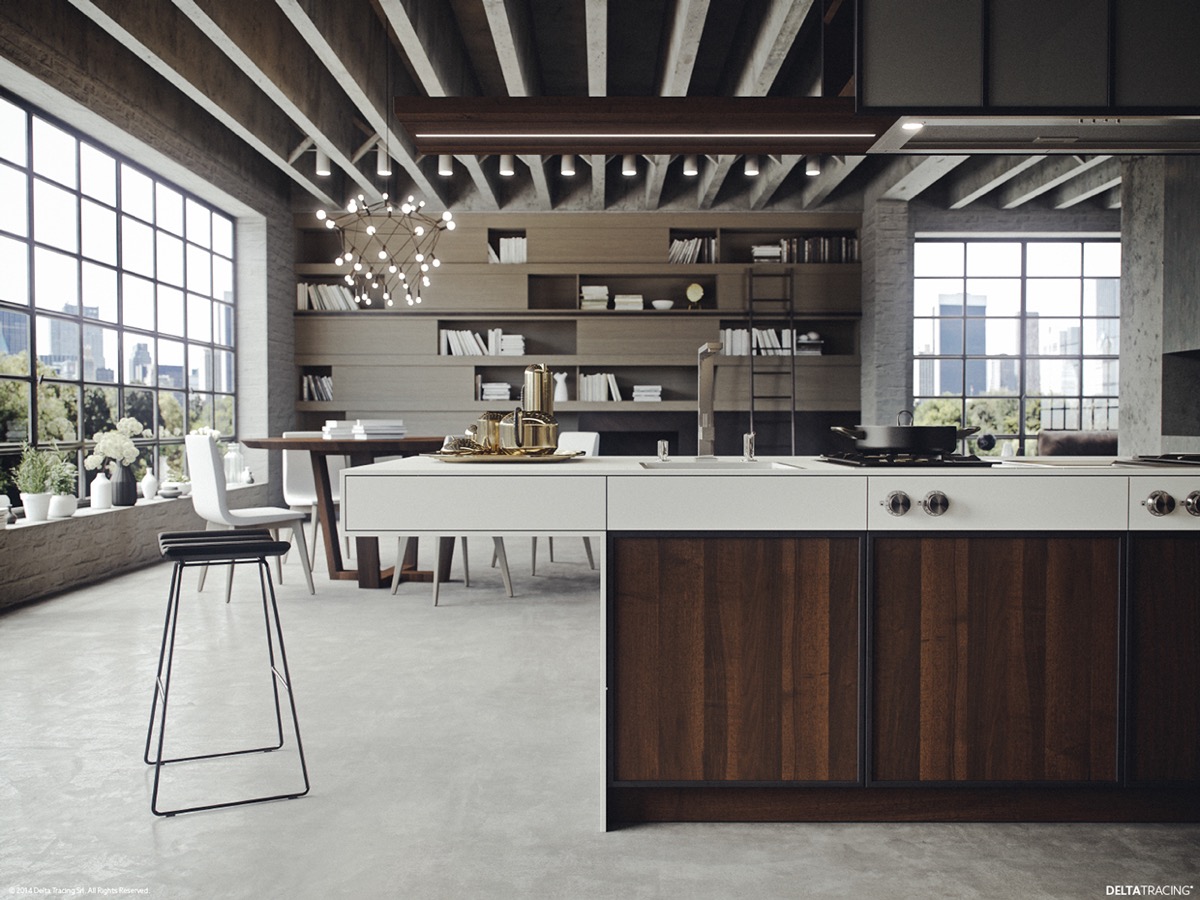 Элементы индустриального и современного стилей, чтобы создать сложное пространство. Стены обшиты тёмным деревом, более светлые тона обнаруживаются в декоре шкафов. Элементы из нержавеющей наполняют интерьер яркими бликами.