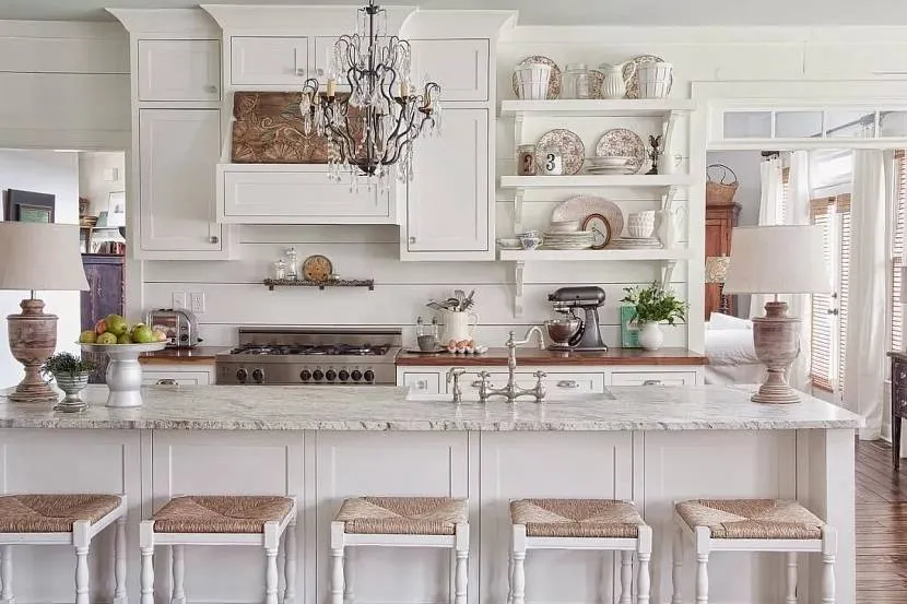 Традиционная белая с легким лимонным оттенком меблировка, характерная для стиля кантри и неожиданные гнутые линии и изгибы, присущие модерну, в сочетании с темной древесиной столешниц и высоких стульев смотрится эффектно и статусно.