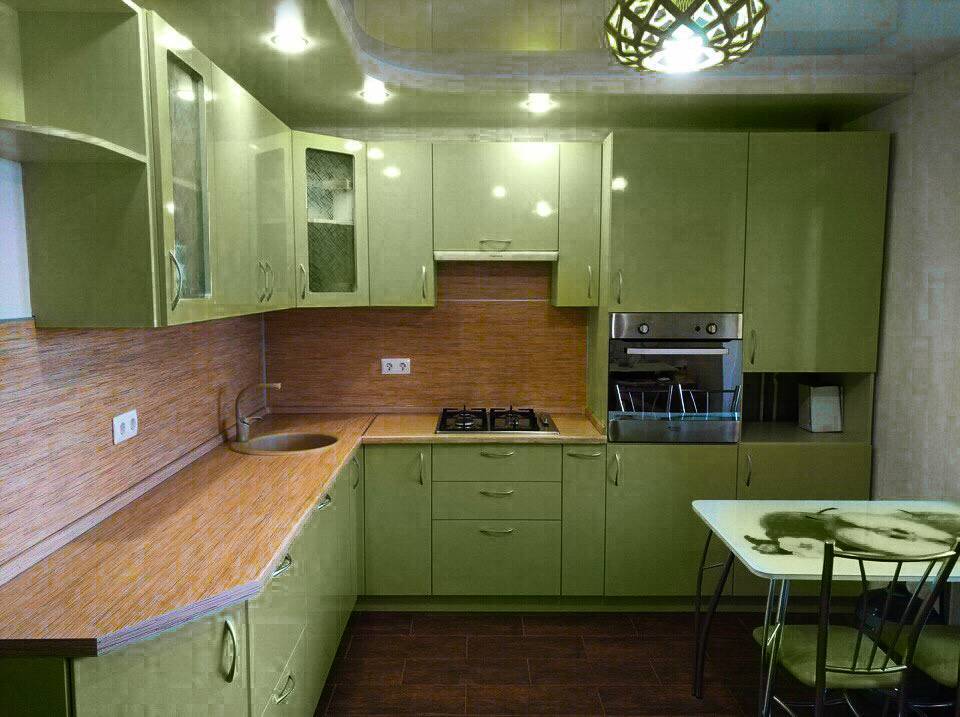 Для потолка применяют побелку, покрывают плоскость белой или кремовой краской. На кухне популярна установка натяжного потолка с матовым или глянцевым покрытием. Фактура из блестящего глянца, за счет отражающего эффекта сделает кухню еще светлее и просторнее. Цвет покрытия может быть нейтральным белым или жемчужным.