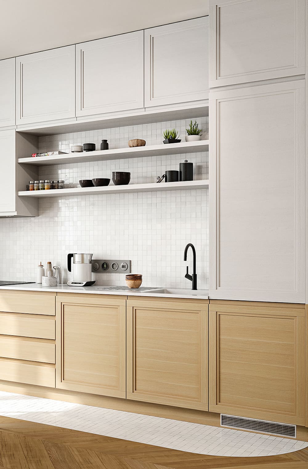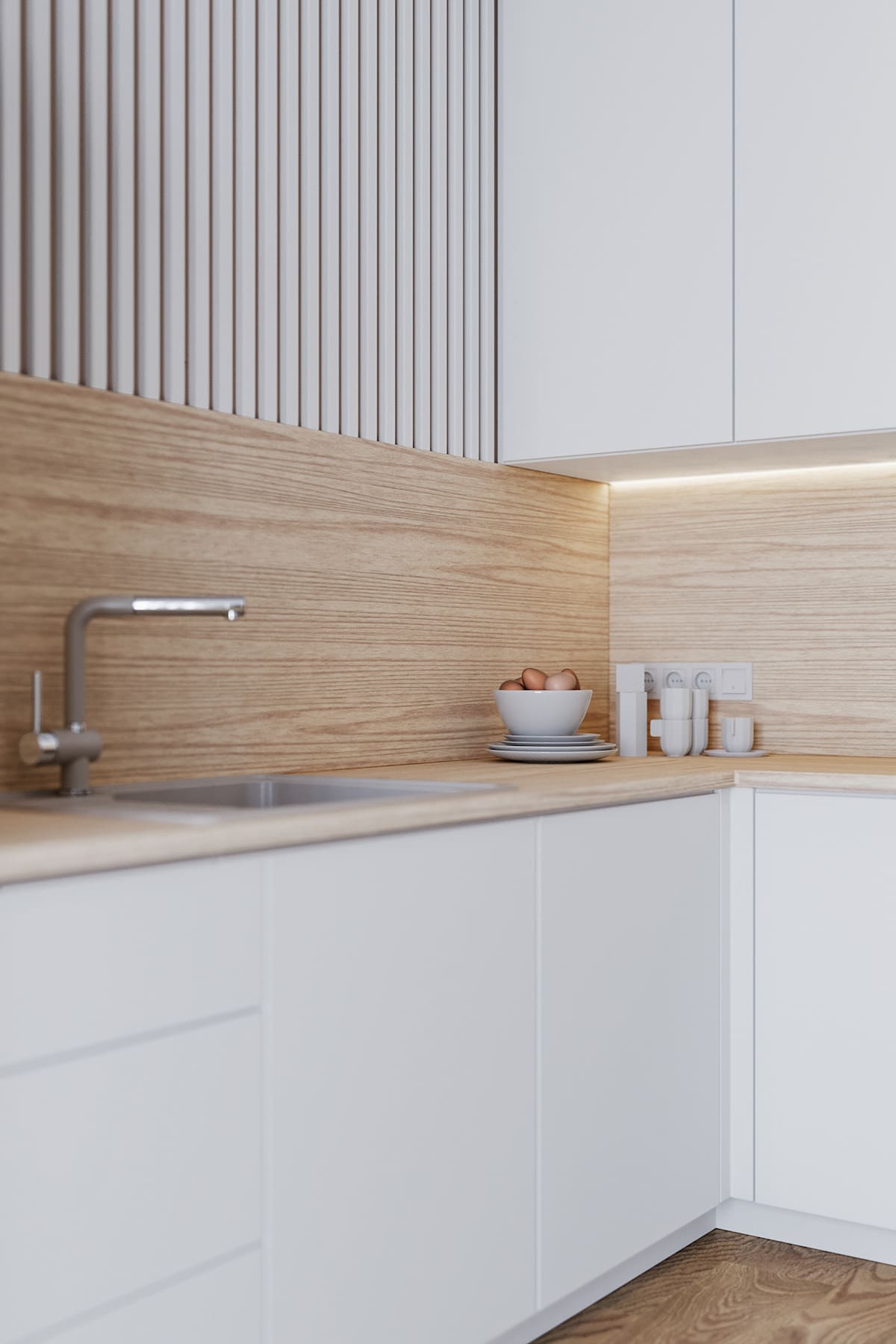 Если ваш интерьер в основном состоит из дерева, вы можете добавить белую мойку, чтобы создать контраст и разбавить теплые тона. Поместите белую мойку на фон деревянной столешницы и пола. Создайте еще больше контраста, выбрав белые или светлые кухонные аксессуары и посуду.