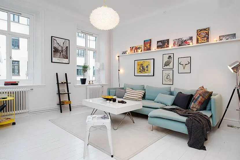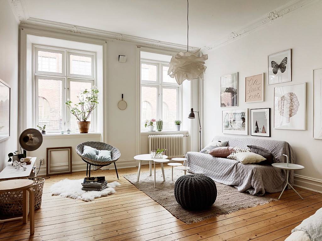 Скандинавский интерьер предполагает изобилие света и белых (полубелых) тонов в сочетании с натуральными материалами. Белоснежные стены создадут легкость и невесомость в интерьере комнат. Их украшением могут стать всевозможные картины, посты, фотографии в фоторамках, висящие на стене или необычные предметы декора в виде шкурок, театральных масок и др.