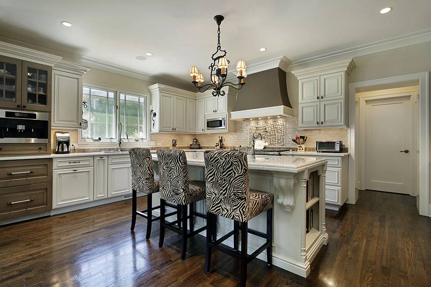 Классика впечатляет своей изысканностью и роскошностью. В интерьере в основном доминируют бежевые, молочные, белые, оливковые и голубые тона. Кухню оборудуют гарнитуром из древесного массива жемчужного цвета, оттенка слоновая кость или белый шоколад. Столешница выполняется из светлого мрамора или черного гранита.