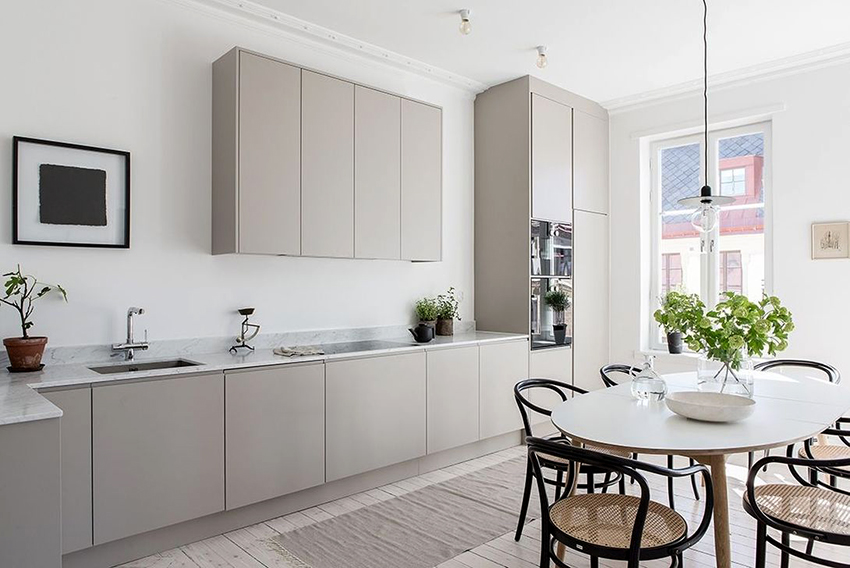 В интерьере в стиле модерн приветствуется мягкая молочная палитра в отделке стен. Для кухни идеально подойдет белый или бежевый гарнитур, который имеет серую мраморную столешницу, гармонирующую со столовым сегментом в бледно-коралловом или оливковом цвете. Общую картину можно разбавить хаотичными черными вкраплениями к примеру, цветочными вазами, картинами, фотографиями или кухонным фартуком.