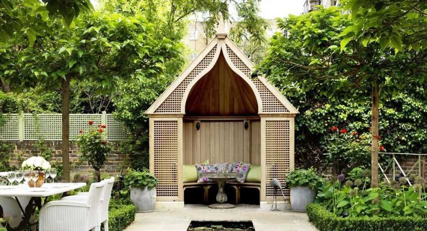 - тщательно продумывают дизайн беседки, который должен соответствовать по стилю имеющимся строениям и определяются с материалами конструкции;