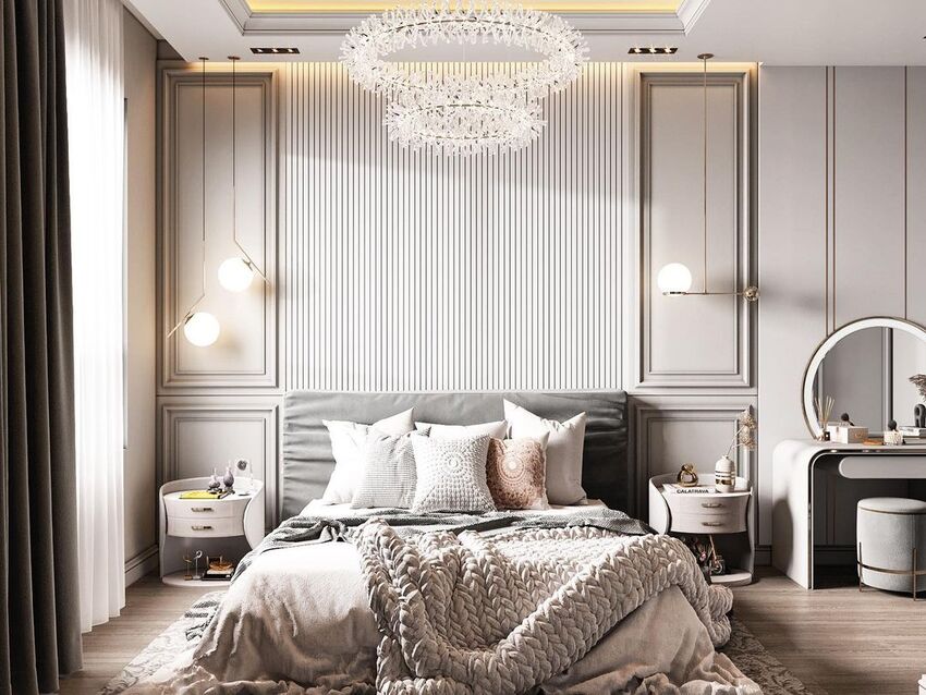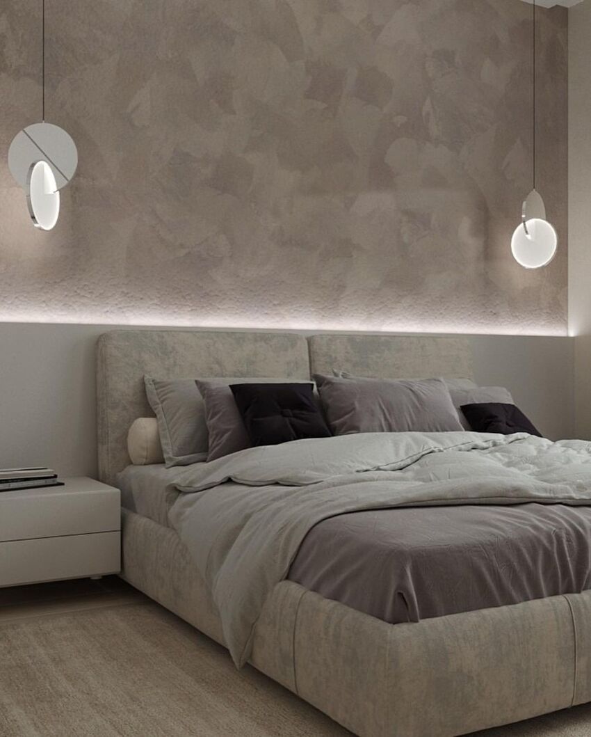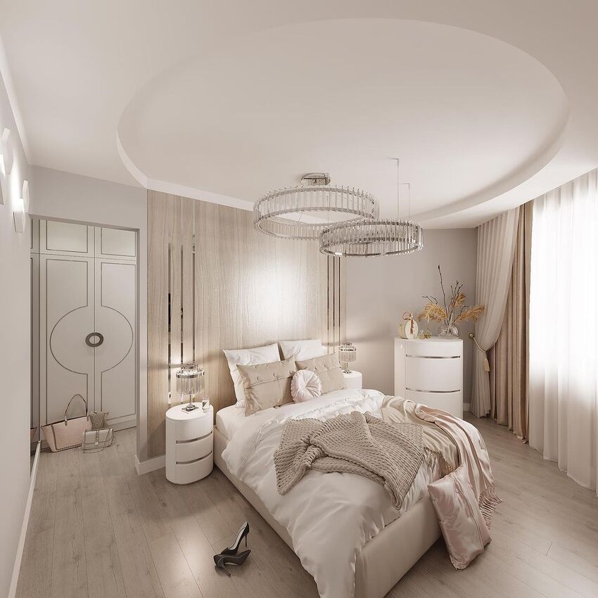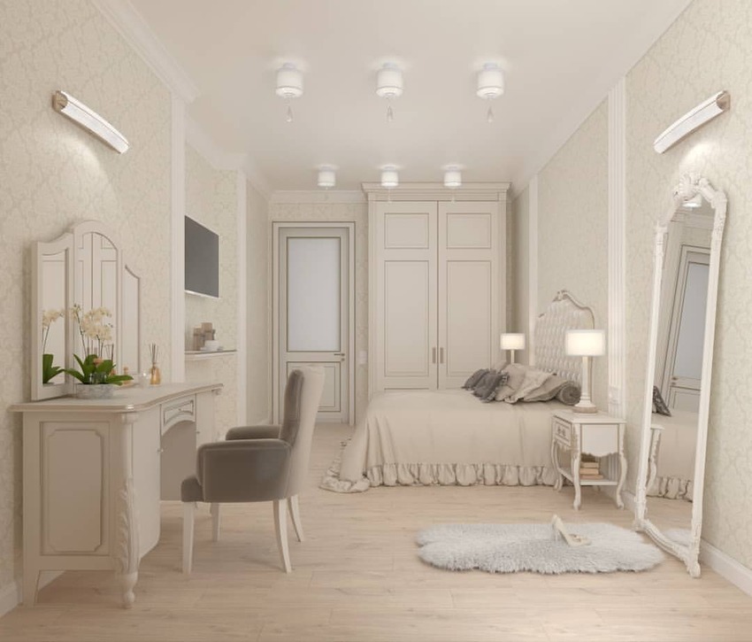 А вот для северной спальни даже светлому бежевому понадобится дополнительное освещение. Кроме центральной люстры стоит использовать настенные бра и точечную подсветку на потолке.