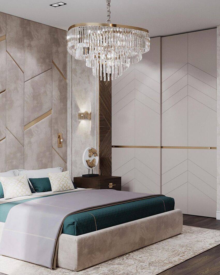 Для бежевых спален хорошо подойдут изящные светильники, сделанные из стекла и хрусталя.