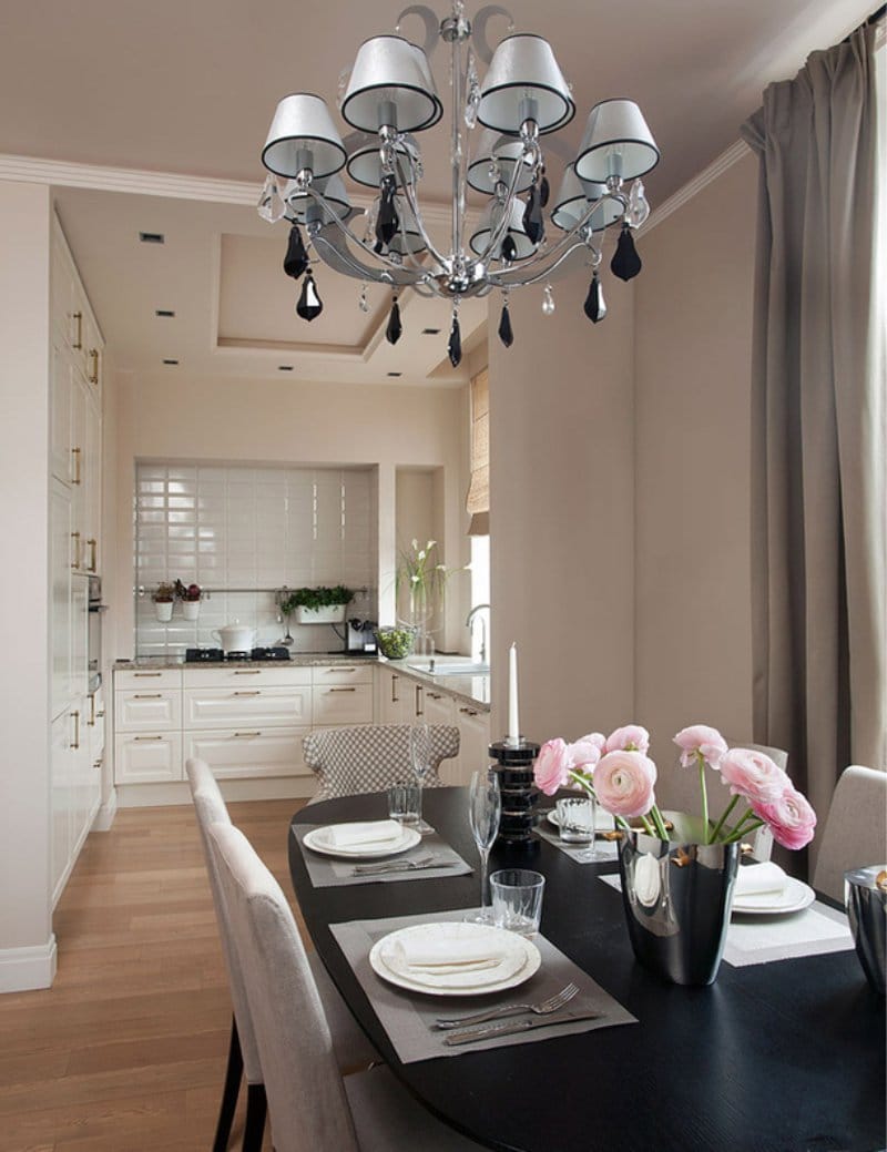 А вот и классическая его интерпретация – с роскошными часами, объемной люстрой и шторами в пол. Все это интересно контрастирует с бытовой техникой последнего поколения и элегантными белыми и бежевыми оттенками разной степени интенсивности.