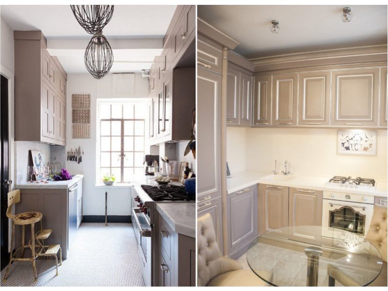 Предположим, вы захотели оформить маленькую кухню в классическом стиле в бежево-коричневой гамме, тогда вы можете поступить следующим образом: выкрасить стены (или поклеить обои) светло-бежевой краской, гарнитур выбрать белый и разбавить эту бело-бежевую идиллию фартуком, столешницей и полом коричневого цвета с холодным подтоном. В такой комбинации темно-коричневый, без которого сложно обойтись в традиционном интерьере, не будет «съедать» пространство, а наоборот расширит его, создав эффект глубины. Пример такого приема представлен на фото ниже.