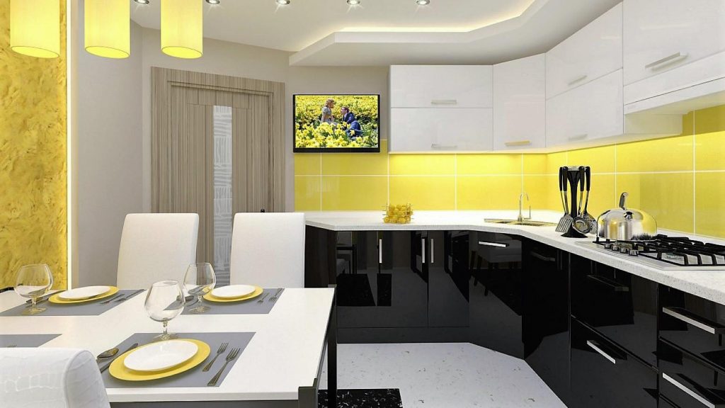 Желтым можно сделать основные детали кухни, например, стены или кухонный гарнитур