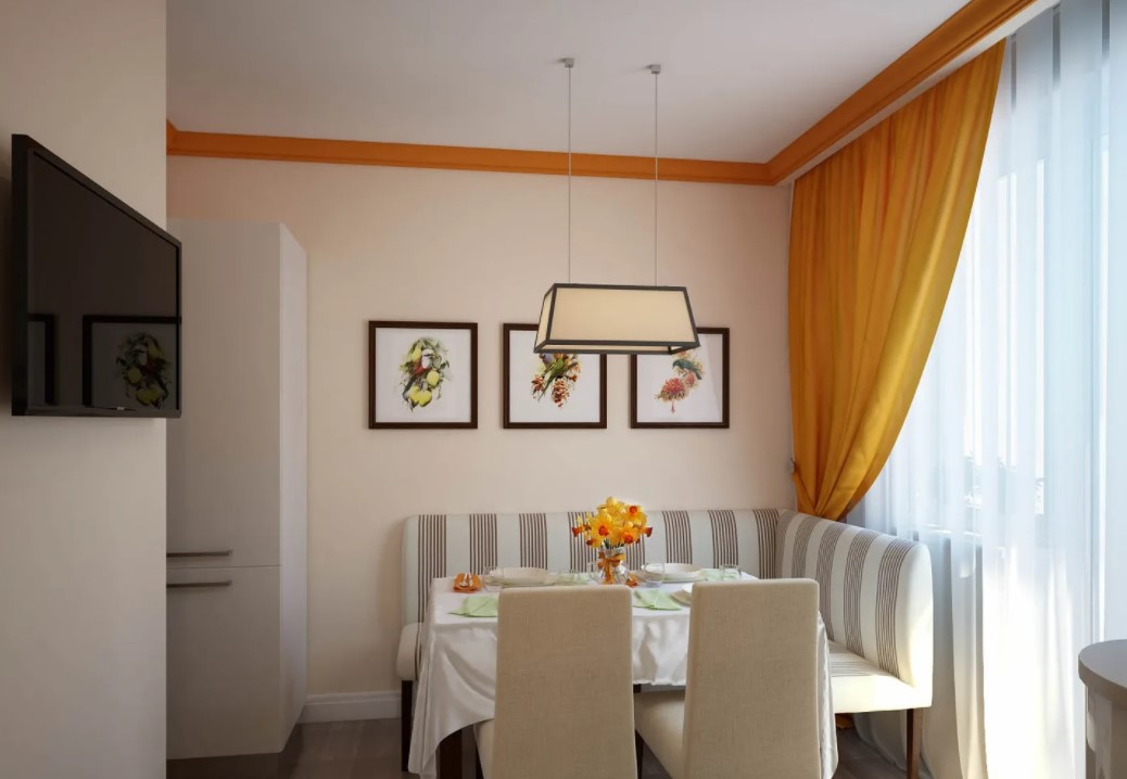- серый фон и шторы — бежевый гарнитур и обеденный стол;