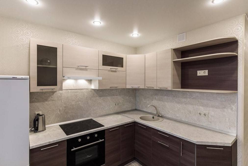 Коричневый и бежевый – одно из самых лучших сочетаний. В кухне, выполненной в таких цветах, сразу хочется присесть и выпить чашечку ароматного кофе, закусив кусочком шоколада