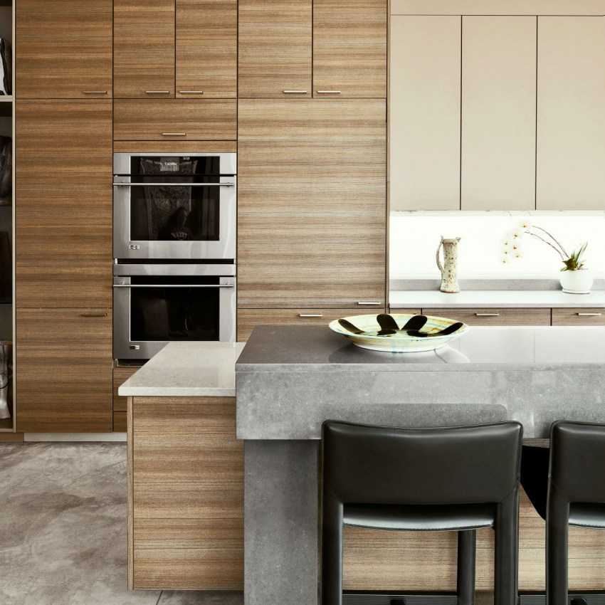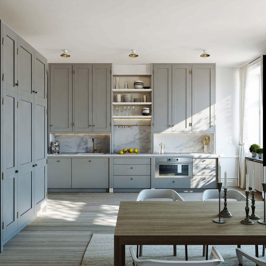 На первый взгляд, абсолютно не сочетаемая связка. Однако на практике все получается как нельзя более гармонично: теплота бежевой кухни идеально смягчает общую холодность серого и наделяет помещение витальной энергией.