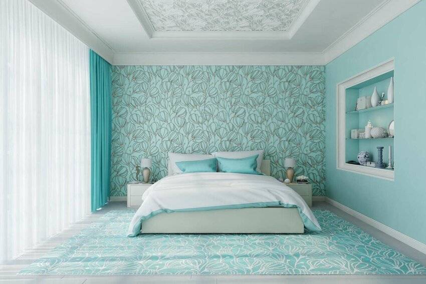 В спальне бирюзовый обычно используется для оформления стен. Их можно покрасить или оклеить обоями, выполненными в этом цвете. Бирюзовый может использоваться локально, для оформления акцентной стены, и более масштабно, затрагивая несколько поверхностей.