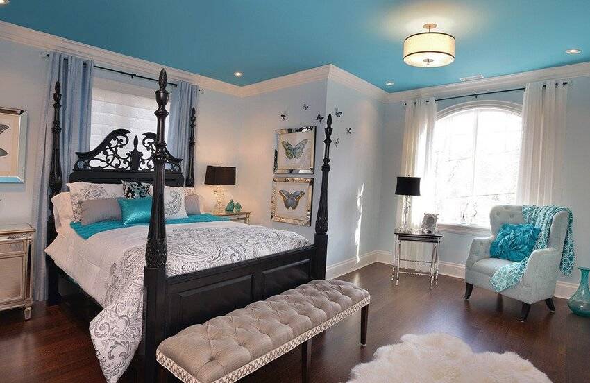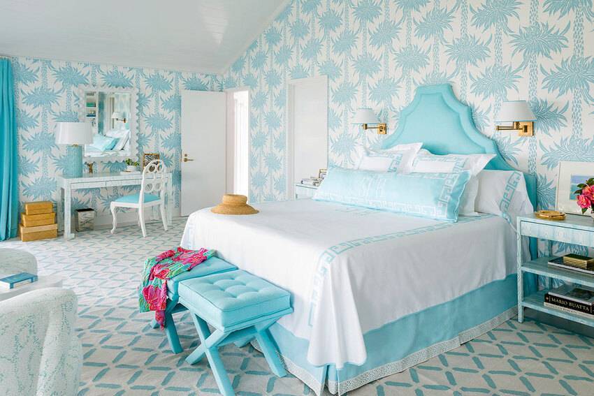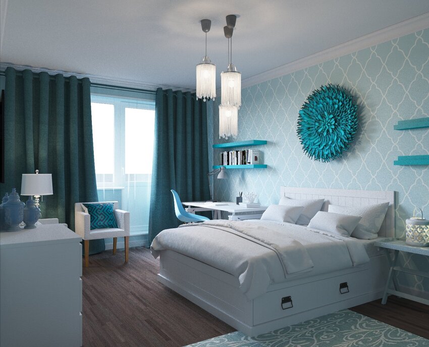 Небесно-голубой оттенок бирюзового в интерьере спальни