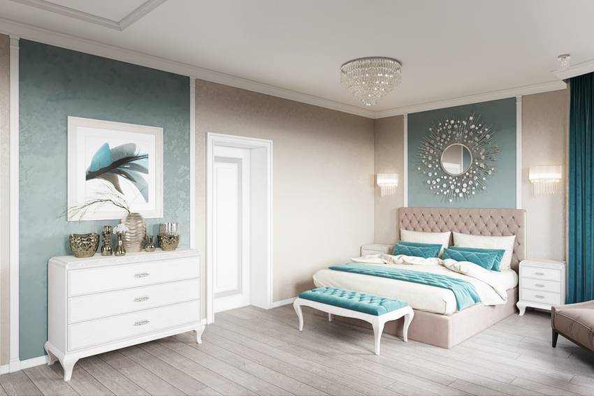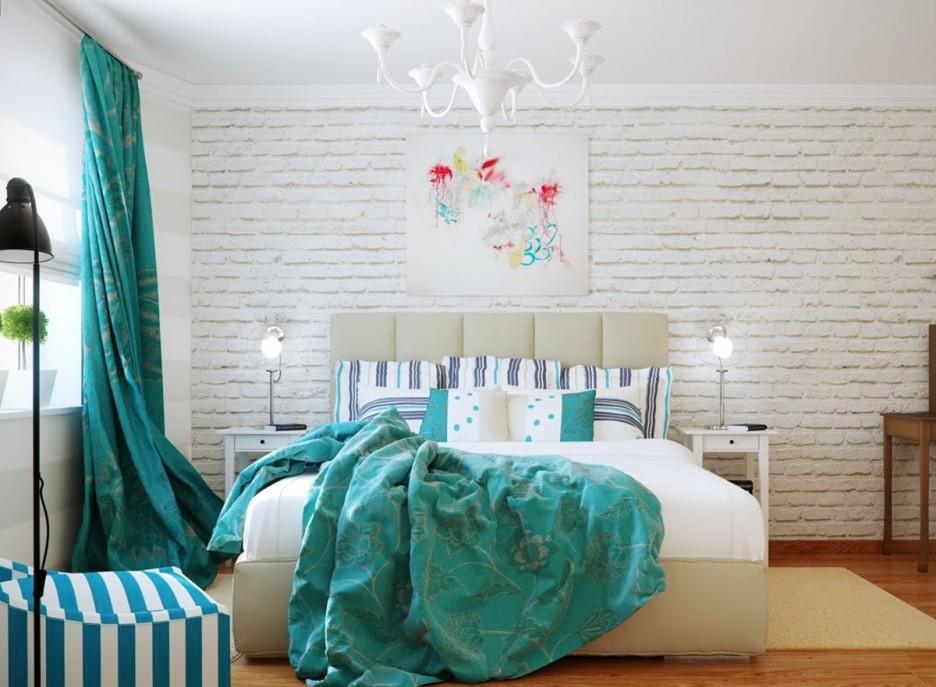 Бирюзовый в спальне может выступать как в качестве акцента, так и в виде основного фона, служащего базой для более нейтральных оттенков. При отделке каждой поверхности существуют свои правила относительно использования бирюзовых тонов.