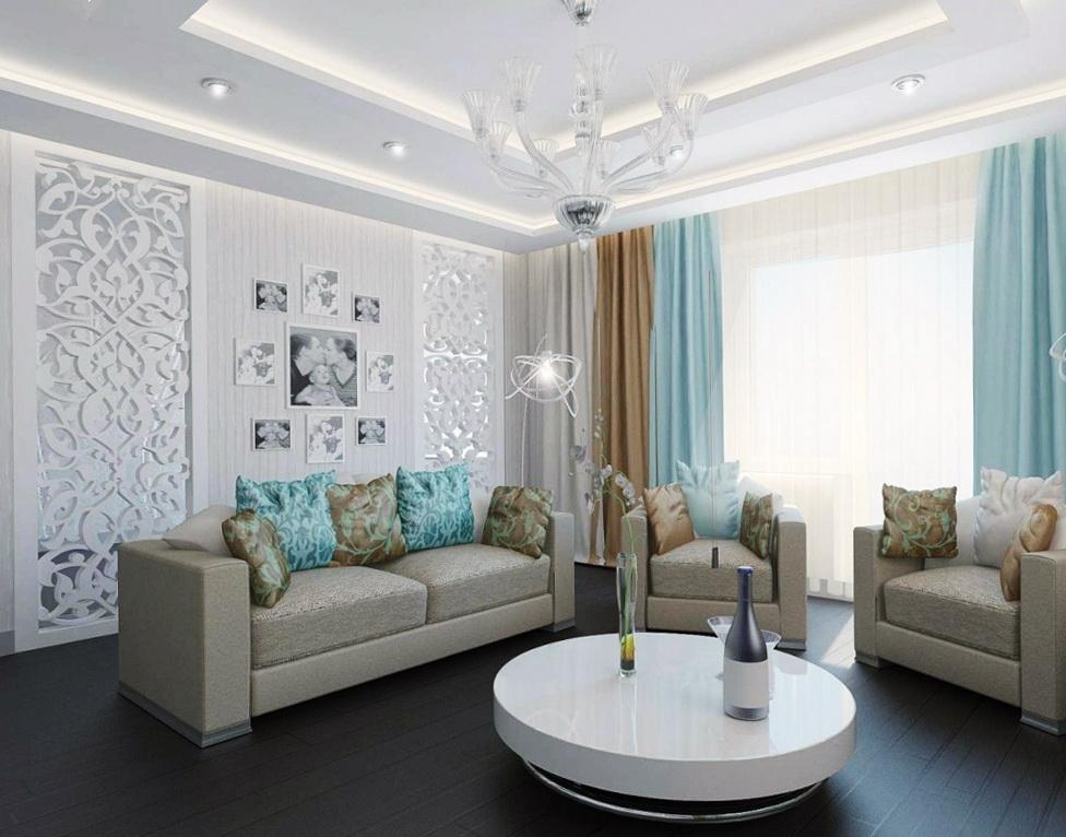 Для интерьеров в других стилях классическим решением будет светлый потолок, отлично гармонирующий с бирюзовым. Для его оформления можно использовать белый, серый, молочный. Такой прием позволит добавить объем пространству, что особенно актуально для северных комнат.