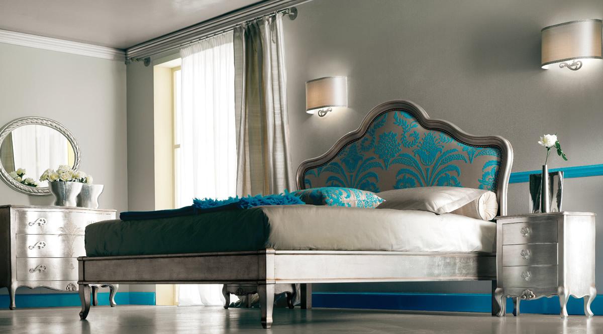 Зеленовато-голубой интерьер в симметричных линиях и благородных текстурах выглядит свежим и легким, лишенным «музейной» витиеватости, поэтому идеально подходит для маленьких уютных помещений. Подчеркнуть классический дизайн в данном случае позволяют дорогие материалы – деревянные полы, мебель из массива, кожаная обивка изголовья кровати, кресел и пуфиков, тканевые обои. В более просторных комнатах не помешает традиционный декор в виде хрустальных подвесок, кованных серебряных и золотых рамок, виртуозной резьбы, ниспадающих пышными фалдами гардин.
