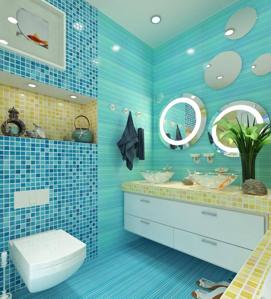 Стены лучше выкрасить в матовую краску бирюзового спокойного оттенка В зависимости от стиля, можно поэкспериментировать. Например, сделать на стенах градиент, или яркие полосы.