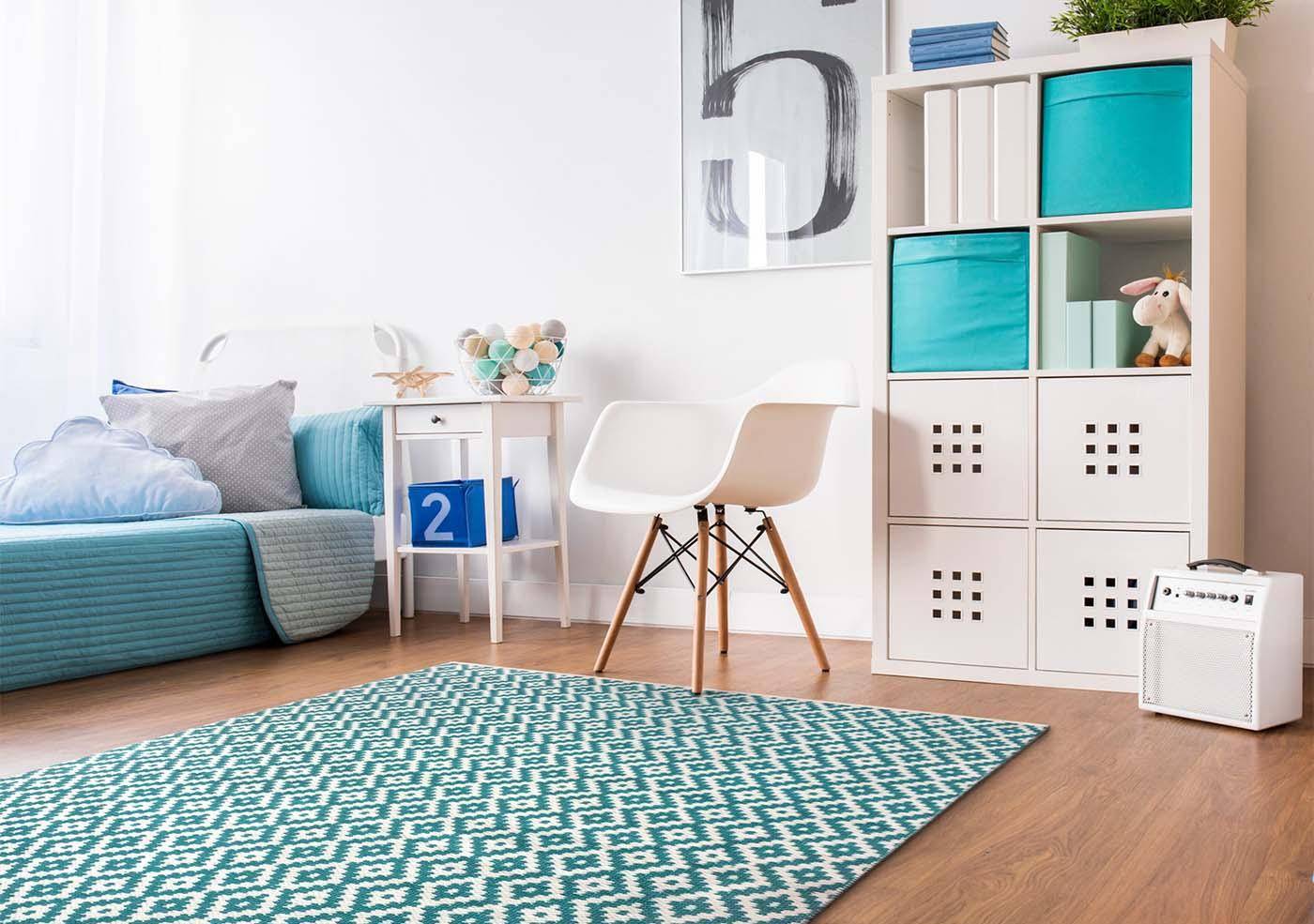 Для отделки пола специалисты рекомендуют использовать натуральные материалы: паркетная доска, ламинат, деревянное покрытие. По цветовой гамме хорошо будут смотреться белый, бежевый и коричневый. Дизайнеры практически исключают применение бирюзовых цветов на полу. Светлая гамма визуально расширит комнату, добавит воздушность и лёгкость в интерьер.