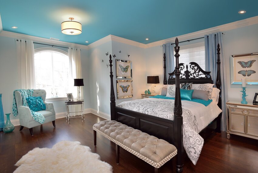 Цветной потолок уместно выглядит в интерьере в стиле хай-тек или в спальне с морской тематикой. Здесь он сможет стать одним из главных акцентов комнаты, а потому его стоит комбинировать с пастельными оттенками.