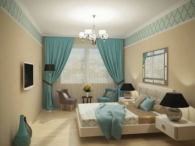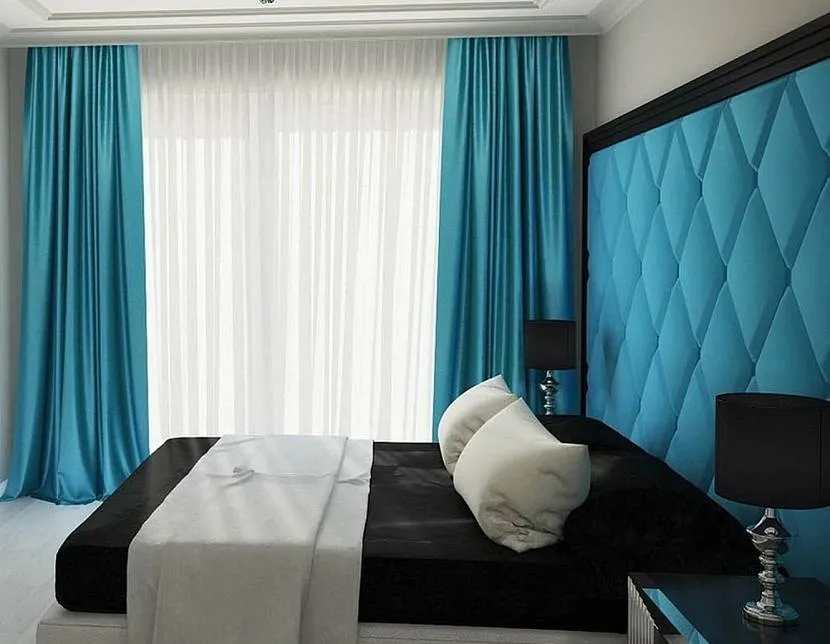 Бирюзовые шторы в интерьере: фото в спальне, гостиной