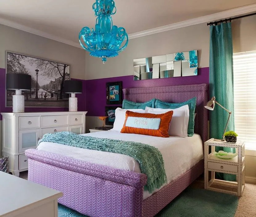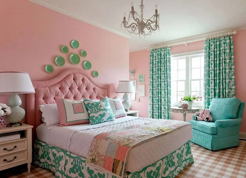 Оттенки розового уместны в комнате девочки и на кухне. Роскошная фуксия дополняет глубину цвета морской волны. Кислотные тона не режут глаз с нежным аквамарином. В бирюзовой спальне красиво смотрятся бело-лиловый и светло-желтый, которые используют в окантовке штор, аксессуарах.