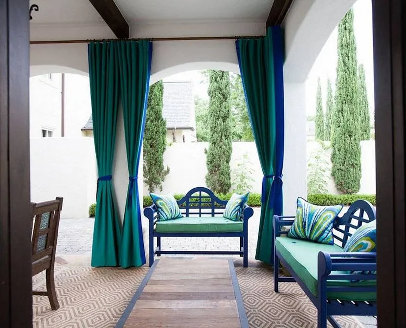 Родственные синий и зеленый–это лучшая комбинация, которая гармонично смотрится в интерьере. Преобладающий в палитре портьер оттенок сочетают с близким тоном. Для холодного циана парой выбирают насыщенный голубой, для бирюзового жемчуга уместен цвет свежей травы.