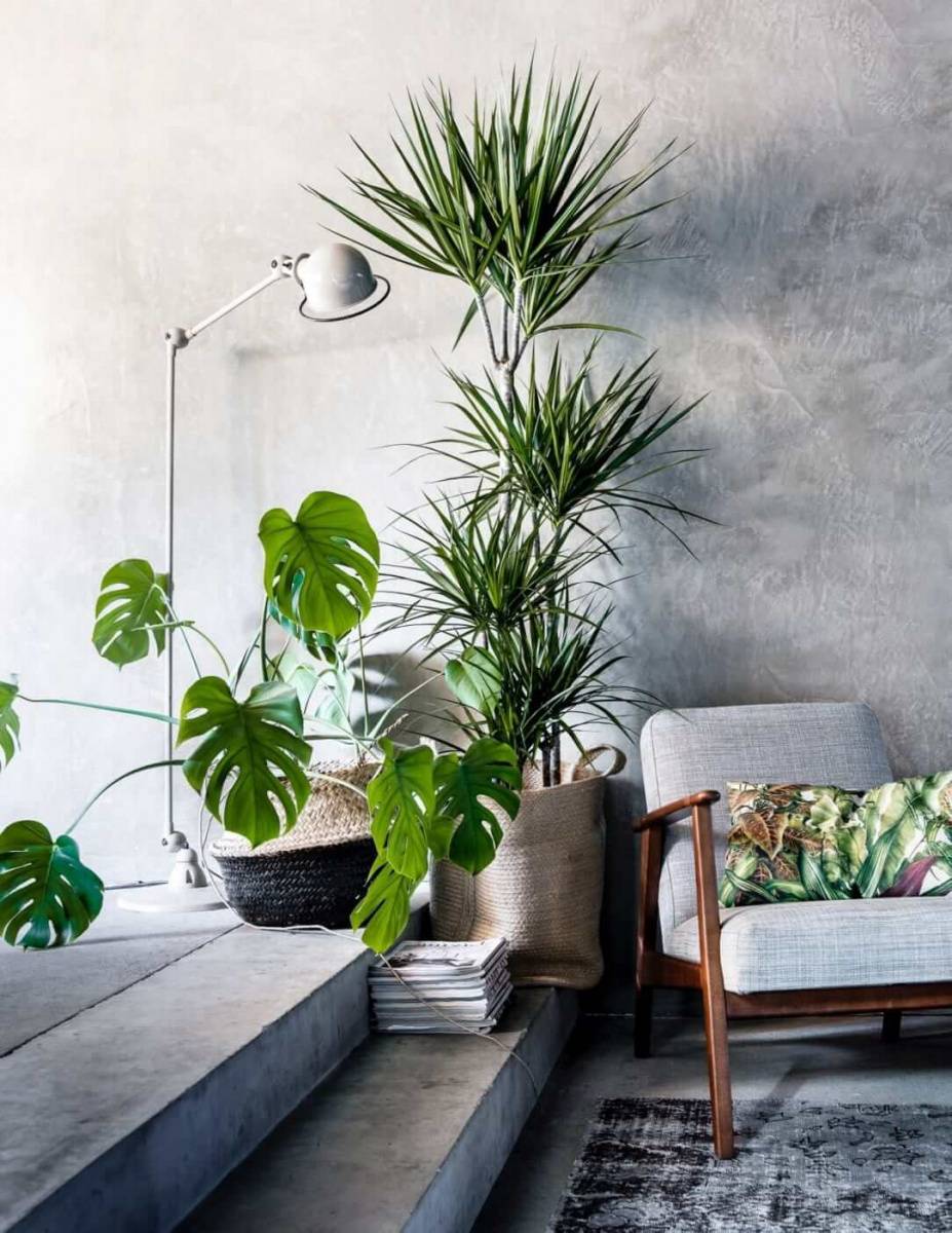 Наиболее неприхотливыми крупными растениями можно назвать фикусы, пальмы, монстеру, комнатный клён, фатсию. Их, если позволяет метраж, можно размещать в гостиной, в зонах отдыха, оранжереях, зимних садах, спальной комнате и даже на кухне. Подходят для оформления оранжерей, зимних садов. Данные разновидности быстро разрастаются и могут достигать в высоту от полутора до трёх и более метров. Поэтому для них подойдут помещения с высокими потолками.