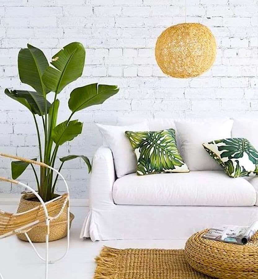 Разбавить однотонный белоснежный интерьер помогут комнатные растения и стилизованные под них декоративные подушки