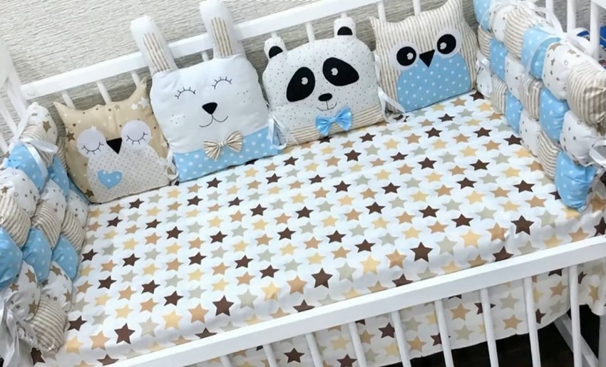 Магазинные полки заставлены готовыми панелями для бортиков и подушек. Это упрощает создание защитной конструкции, ведь среди ассортимента есть заготовки с принтами, вышивкой, пэчворком. Создание бортиков в виде подушек доступны даже неопытным швеям и хорошо подходит для первой работы.