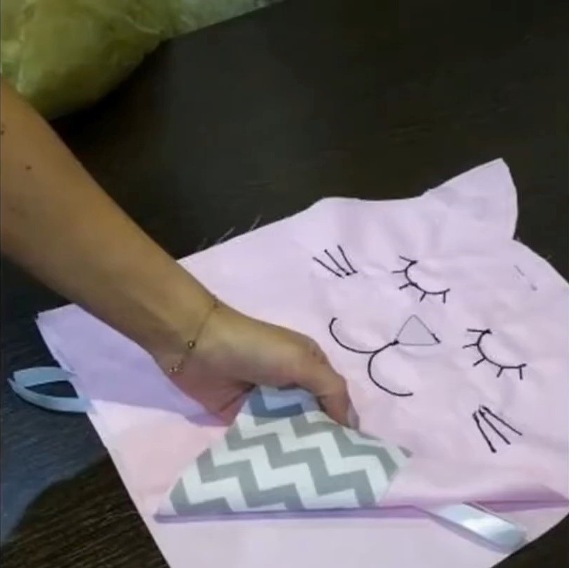 Складываем ткань пополам лицевой стороной друг к другу. Прошиваем по кругу, оставив небольшое отверстие для того, чтобы можно было вставить наполнитель. После того как наш наполнитель окажется внутри чехла, потайным швом зашиваем оставшееся отверстие. Такие манипуляции проводим в отношении каждой детали.