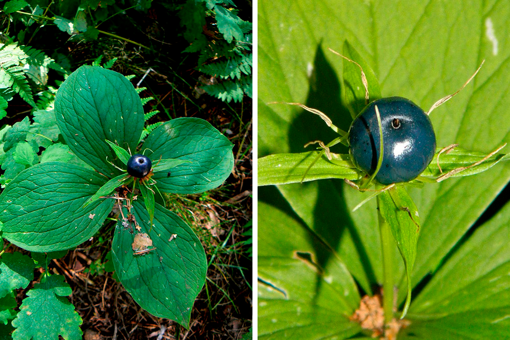 Листья яйцевидные, заостренные на верхушке, с тремя продольными жилками. Цветок крупный, одиночный. Ягода на каждом кустике всегда одна — шаровидная, диаметром около сантиметра, блестящая, черная, с синеватым отливом. Цветет вороний глаз в мае, плодоносит в августе.