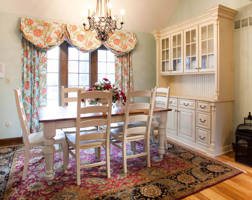 Другой вариант – подобрать внешний вид буфета под стиль и цвет мебели в гостиной или столовой. Это может быть тот же вид древесины, что и у обеденного стола. Или чтобы оттенок фасада шкафа совпадал с цветом спинок стульев. Возможно, фрезеровка буфета перекликается с линиями на ножках остальной мебели.