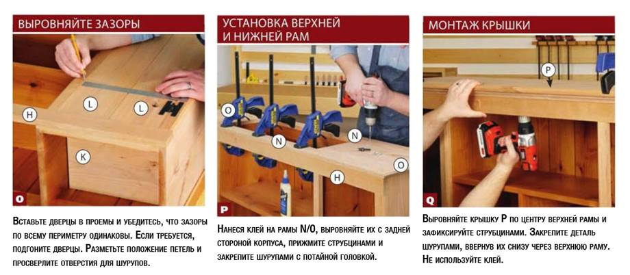 В боковинах и дверках стамеской или фрезером вырежьте посадочные места под петли. Навесьте дверцы, привинчивая петли шурупами. Просверлите два отверстия в вертикальных планках фрамуг по центру и прикрутите две ручки.