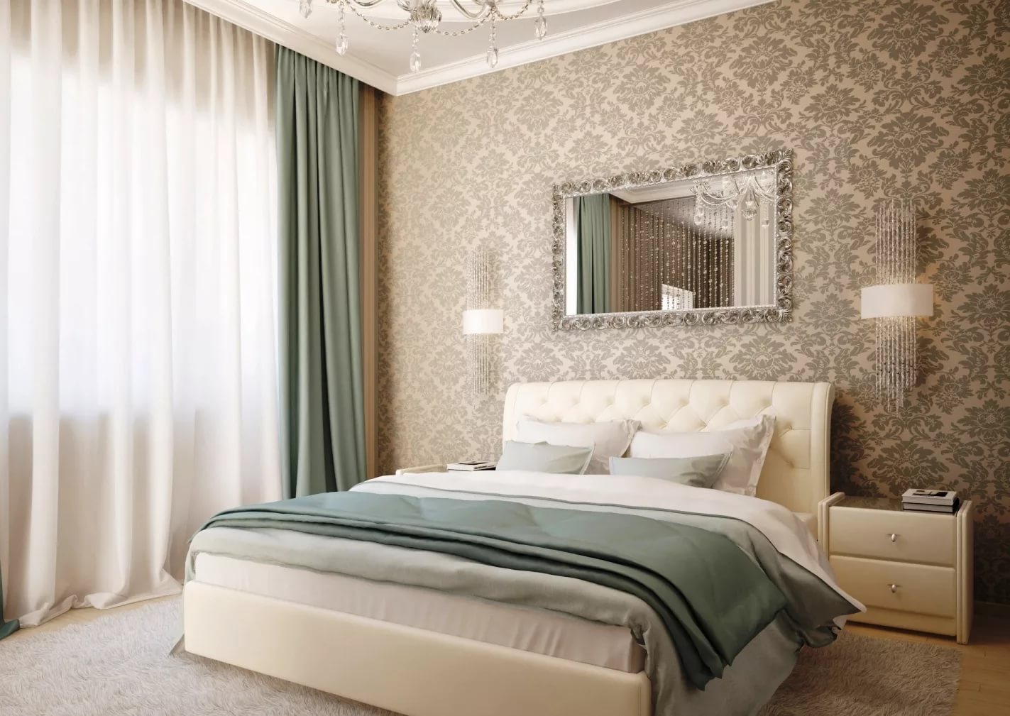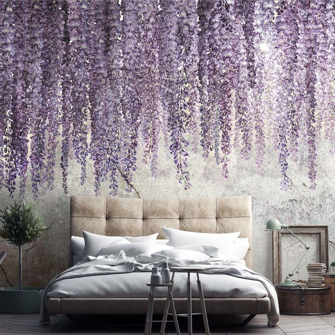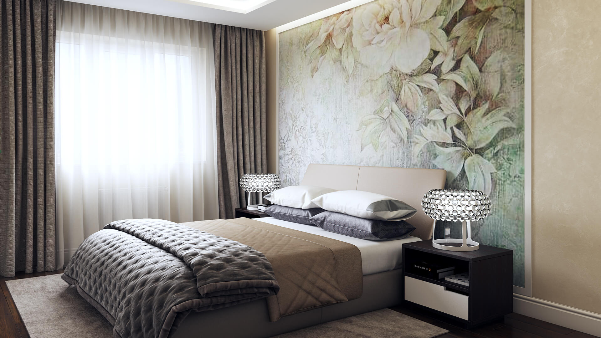 В спальне, как правило, отдается предпочтение спокойным оттенкам. Гармонично будет смотреться комбинирование спокойного оттенка основных обоев и фотообои с растительным принтом в изголовье кровати.