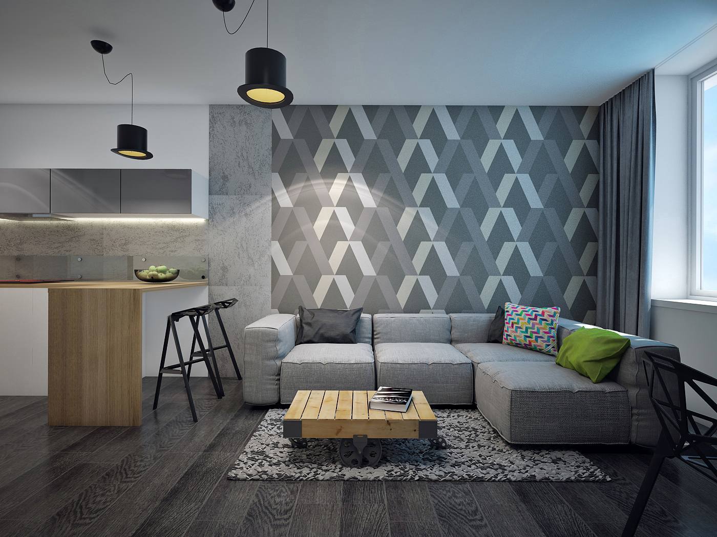 Для своеобразного лофтового интерьера гостиной наиболее подходящим решением станут обои, имитирующие состаренную кирпичную кладку. Потрясающе здесь будет смотреться одна из стен, где кирпичики словно «выглядывают» сквозь полуобсыпавшуюся штукатурку. Ты можешь также имитировать оголенную бетонную стену, оклеив ее однотонными гладкими обоями в сером цвете.