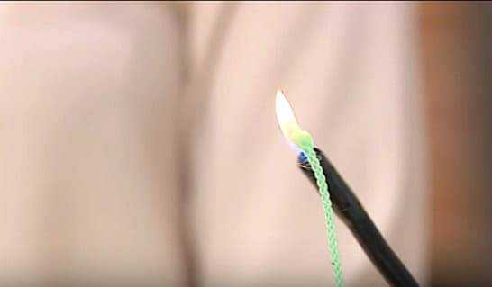 В полученное отверстие вдеваем веревку. Ее кончик лучше подпалить. Если берете шелковую нить, то ее можно вдеть в иголку.