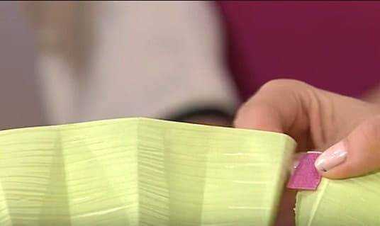 Следующим шагом будет создание «веера» на нижнем крае. Для этого снова отрезаем небольшую полоску скотча, шириной меньше, чем ширина полосы нижней складки и длиной около 15-20 см. Наклеиваем ее на одну из сторон, рассматривая отверстие в ней в качестве разделителя сторон ширины полосы, как показано на фотографии ниже. Затем убираем защитную пленку с клейкой ленты и сводим концы нижнего края так, что бы получился «веер». Прижимаем складочки между собой.